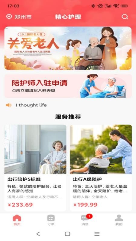 1、打开软件中用户就可以选择服务类型,能够在这里查找推荐的陪护服务项目;