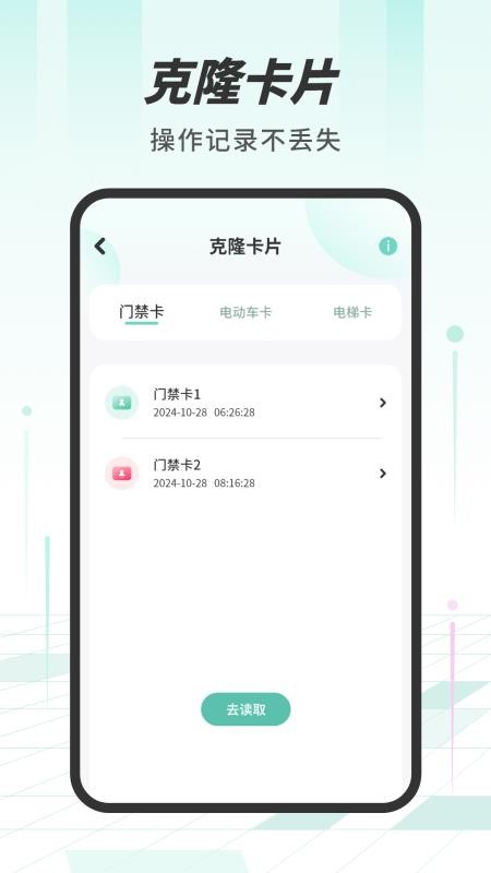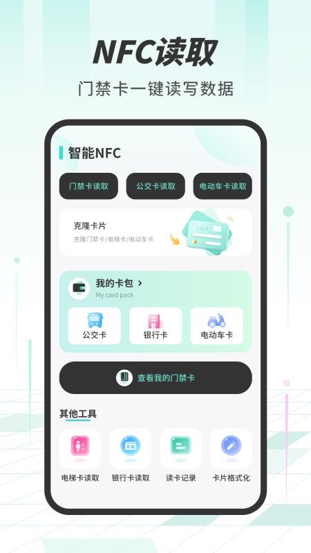 NFC读卡能够对更多的NFC卡片全面扫描识别,可以实现多种多样的使用操作,满足用户的更多使用需求;支持卡片数据克隆、数据格式化等多种操作,管理nfc卡片更加容易;拥有最简洁大方的使用页面,所有功能都很清晰,可以快速学会NFC卡工具使用操作,从此携带一部手机就能轻松出行。